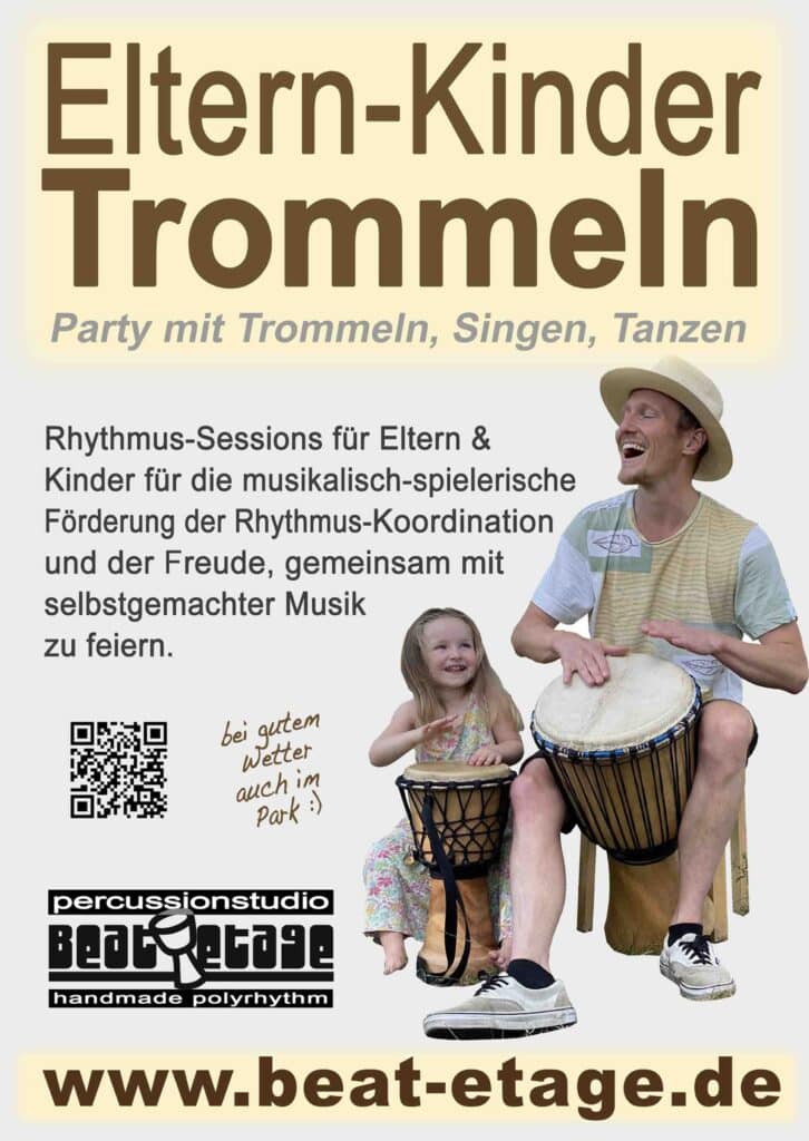Bei den Eltern-Kind-Trommel-Sessions ist Zeit und Raum dafür, mit einer Gruppe 45 Minuten lang mit allen Sinnen aktiv zu feiern!